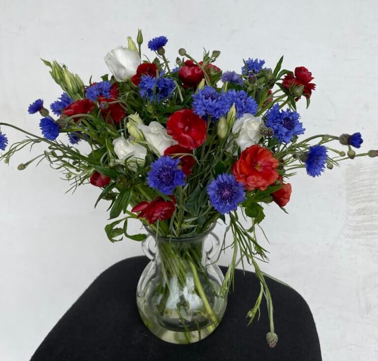 The Americana arrangement was made with white Lisianthus, red Butterfly Ranunculus, and blue Cornflower. We suggest trimming all your flowers with a diagonal cut to ensure they get optimal hydration.