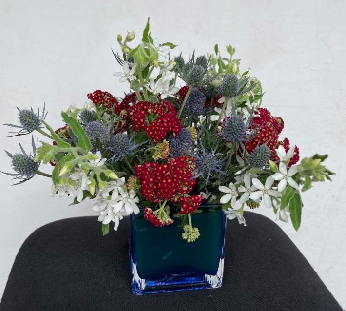 Our Firecracker arrangement was made with white Tweedia, red Cottage Yarrow, and Blue Thistle Eryngium. For this arrangement, we cut our flowers down to about 6 inches and placed them into a small block of Oasis flower foam to help give it structure, but you are free to simply cut and arrange how you please!