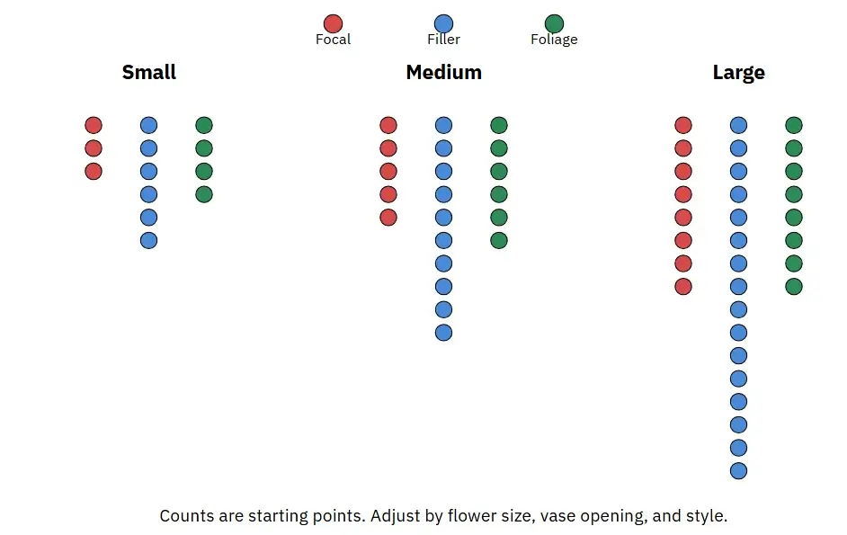 The three columns show suggested mix counts for Small, Medium, and Large arrangements. Adjust counts by bloom size and vessel. Counts are starting points. Adjust by flower size, vase opening, and style.