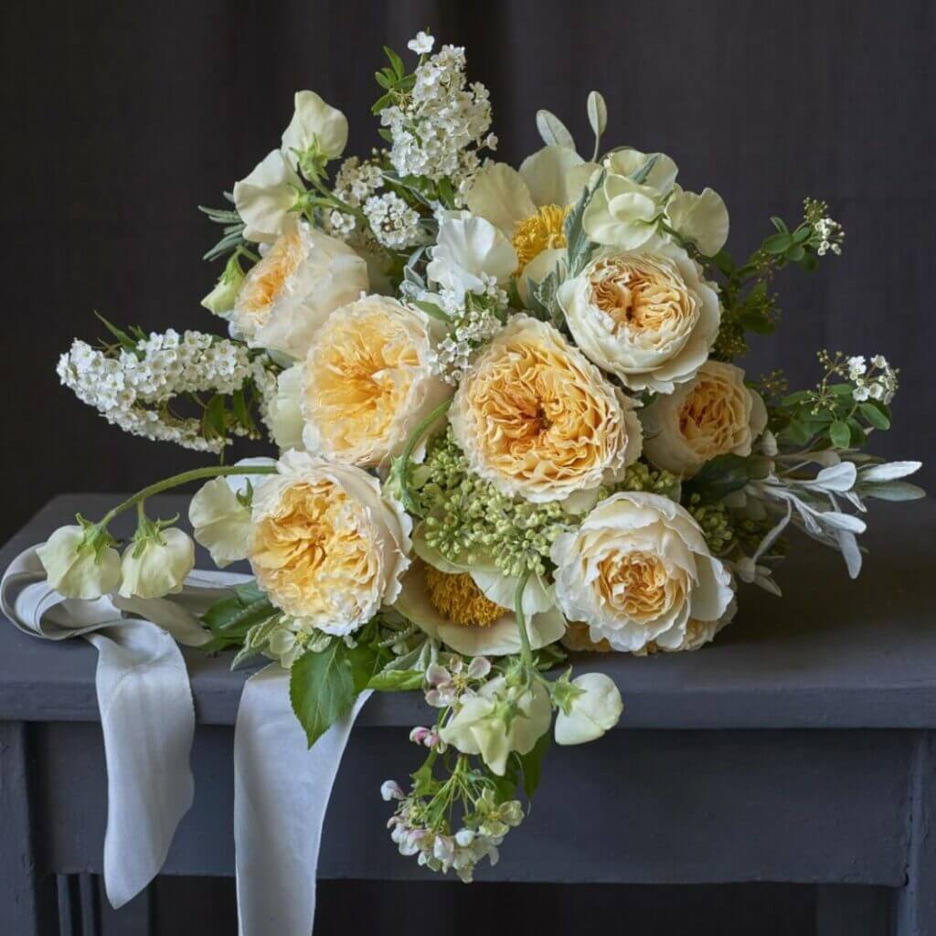 Spring Peonies, Tulips, Ranunculus, Hyacinths, Lilacs, Daffodils, Sweet Peas Baby’s Breath, Eucalyptus, Ferns, Waxflower