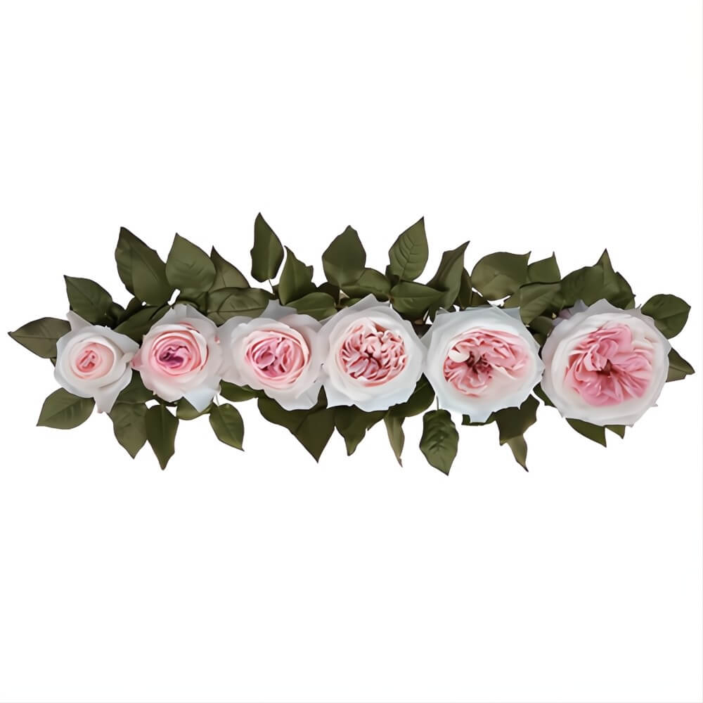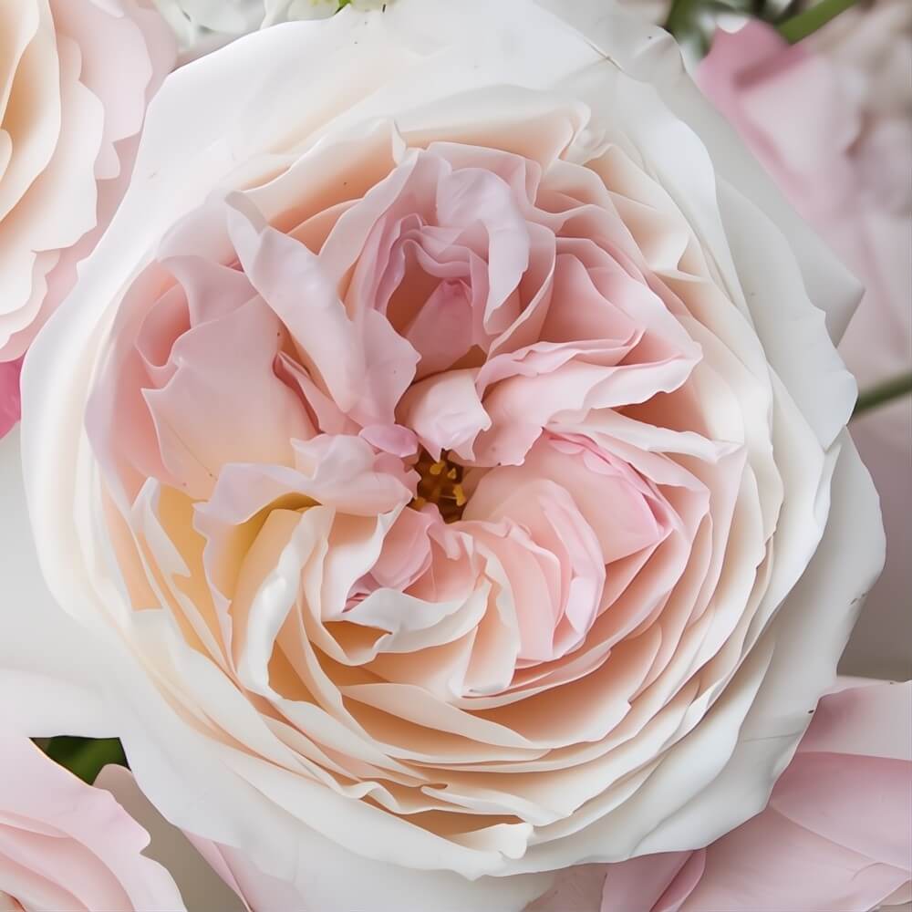 Wholesale Blush Keira Garden Roses by David Austin® are the epitome of romance, featuring soft creamy blush pink blooms with marbled petals blending shades of marshmallow and raspberry pink. Each bloom is ruffled and gloriously unpredictable, exuding a delightful fragrance of almond, marzipan, and vanilla. These roses are grown in South America, come in bunches of 12 stems, and have a stem length perfect for elegant arrangements. We recommend placing your order in advance, as these roses require up to 4 days to fully open.