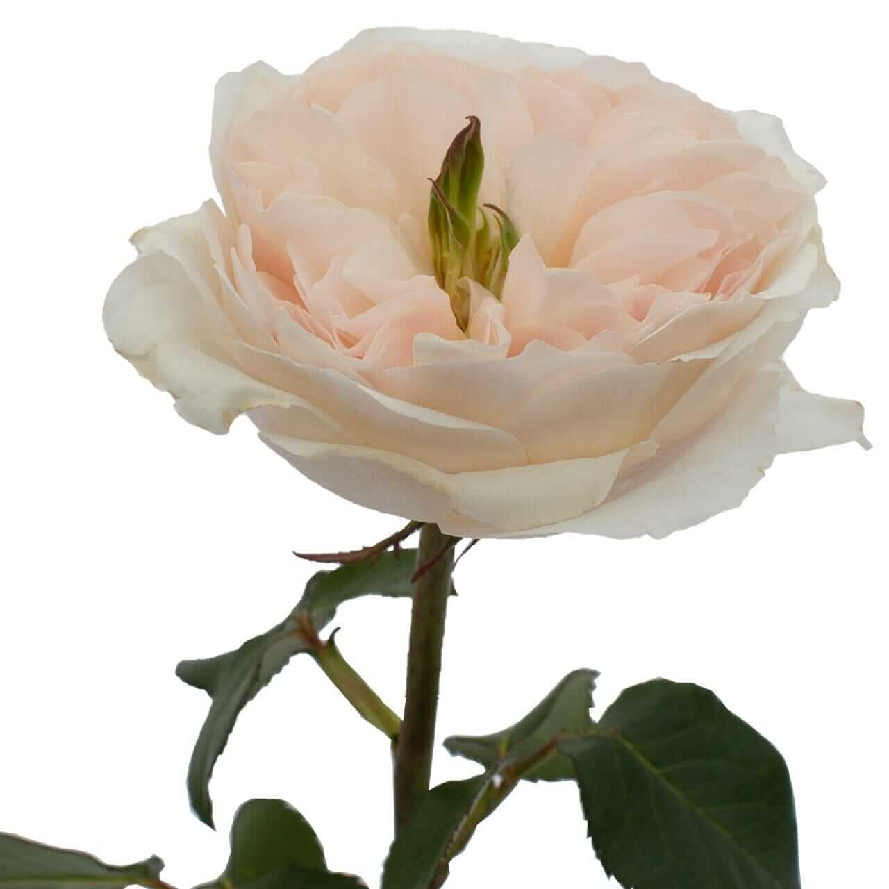 Note: A unique blush garden rose where the center green stamens are distinctly on display, this rose is perfect for a cottage garden vibe. A relatively quick opener, Charity will often be fully open within 24 hours of arrival and ready to be placed in designs.