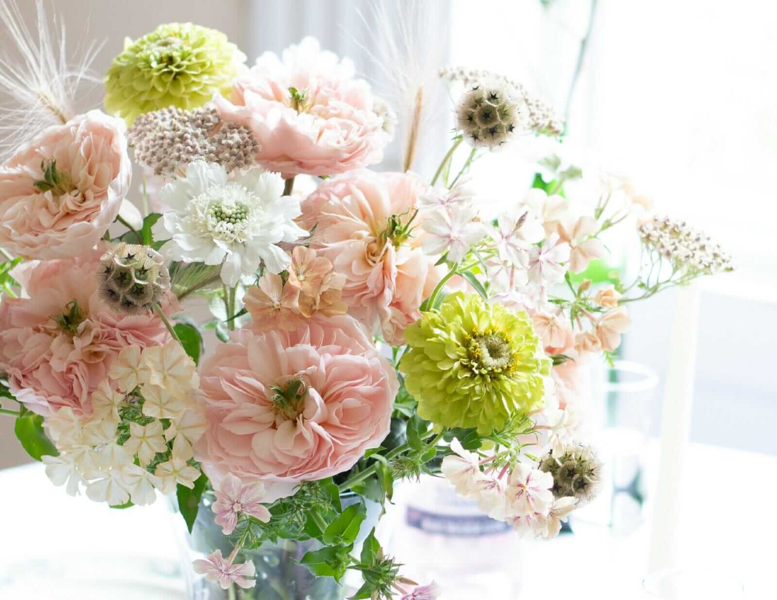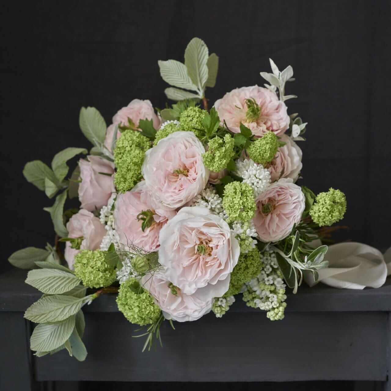 Charity (Auswasher) Roses are truly unique among all roses in the David Austin Wedding Rose Collection as their lime green stamen is notably on display in the center of each bloom. The visible stamen adds to its charm and makes it a playful rose when designing with a variety of cottage garden seasonal flowers and foliage. Charity’s blooms are romantic soft pink with warm peach overtones.