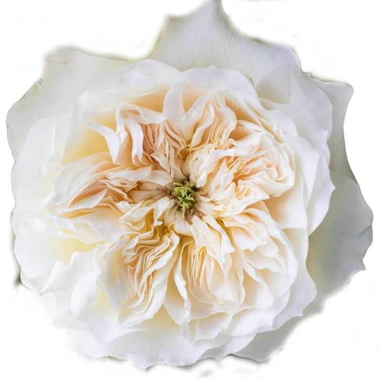 Enid is a mesmerizing, attractive rose that exudes confidence and strength. She is a true cream color with accents of pistachio green on her outer petals and a green stamen at her center. With a deep cup shape and ruffled petals, Enid is unusual and daring! Her fragrance is a delicate rose perfume, laced with a subtle hint of myrrh.