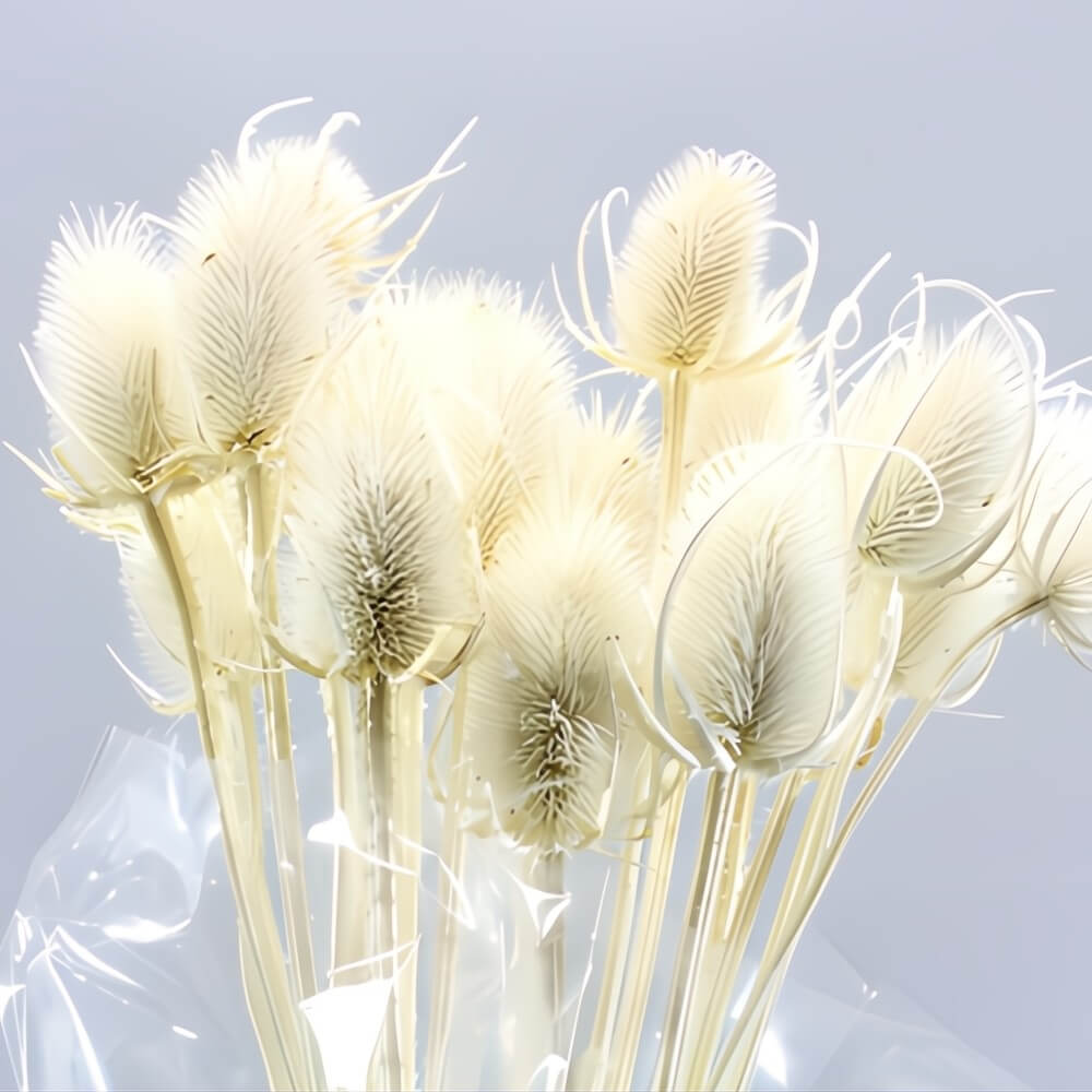 Wholesale Dried Bleached Cardi Palustri features striking thistle-like blooms with a bleached finish, making them an eye-catching addition to any arrangement. These preserved stems bring texture and uniqueness to dried and fresh designs. Sold in 7-stem bunches, Dried Bleached Cardi Palustri offers lasting beauty that will remain vibrant for years.