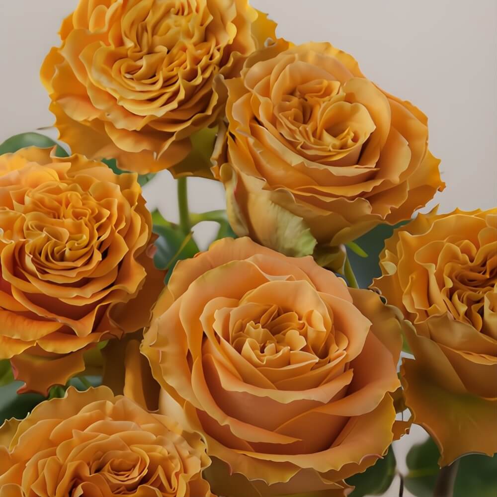 Wholesale Gold/Orange Copper Kiss Roses feature large, eye-catching blooms with ruffled petals reminiscent of garden roses. Their warm coppery-orange hue brings depth and elegance to any arrangement, making them a standout choice for weddings, special events, or seasonal designs. With 25 stems per bunch, these roses are perfect for crafting luxurious bouquets or striking centerpieces. Their versatile color pairs beautifully with soft neutrals, vibrant greens, or bold tones, allowing endless possibilities for creative floral arrangements that truly captivate.