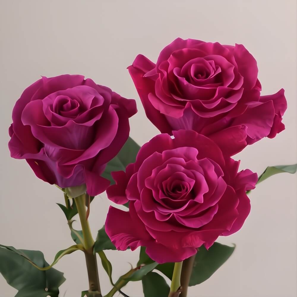 Wholesale Lavender/Purple Mamy Blue Roses are a stunning magenta to fuchsia rose variety with a sweet, pleasant fragrance. Each bloom offers a unique furrowed texture that blends beautifully when paired with softer, less intense floral hues. This tropical rose is particularly ideal for adding a burst of color and vibrancy to wedding arrangements, including bridal bouquets, centerpieces, and event decorations. Sold in 25-stem bunches, Mamy Blue Roses provide a striking visual impact, making them a favorite choice for florists and designers.