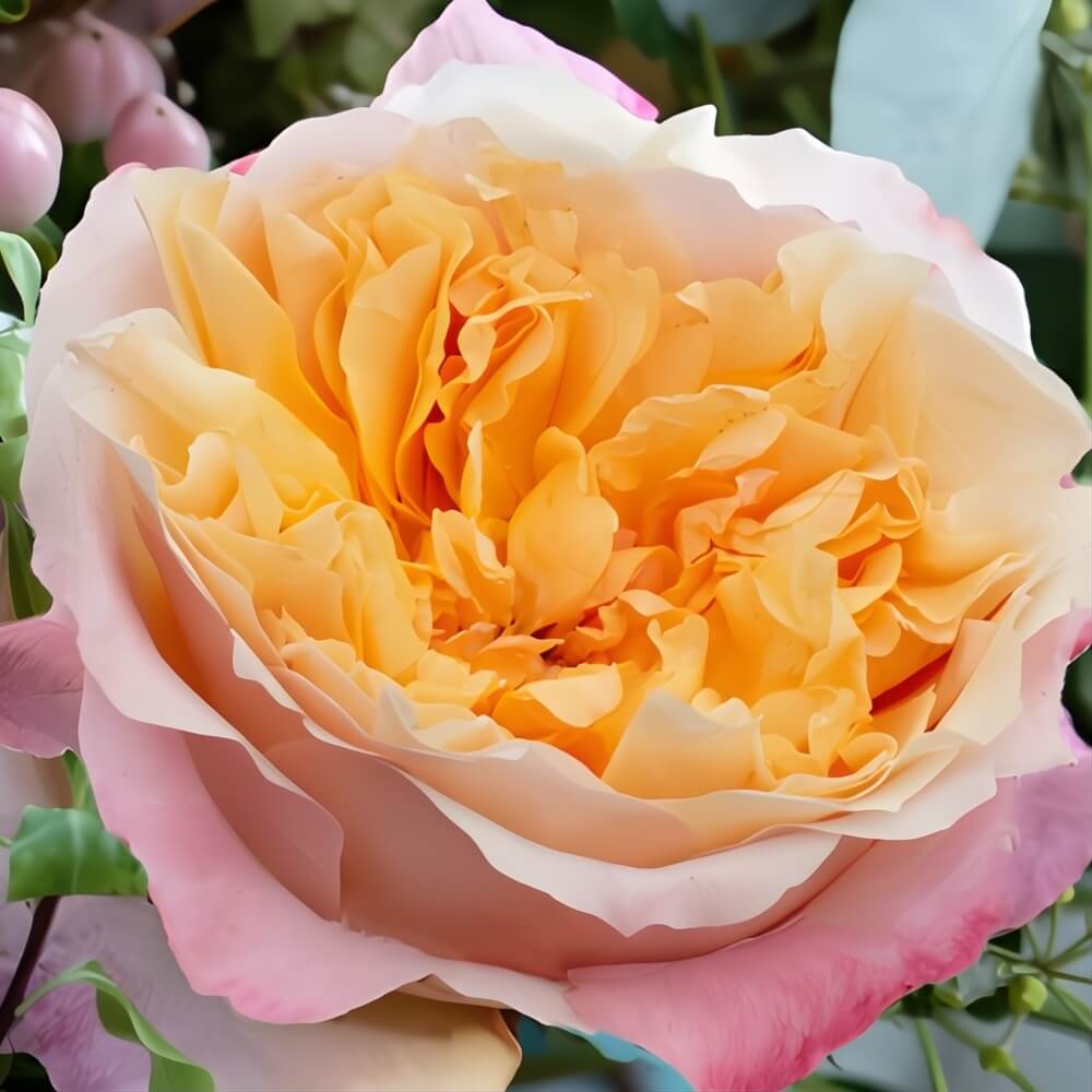 Wholesale Peach Edith Garden Roses, part of the David Austin® collection, are a luxurious two-tone variety featuring old gold and warm peach centers surrounded by yellow and deep rose tones. These fragrant blooms open into a classic, quartered rosette shape, making them perfect for wedding bouquets, event centerpieces, and everyday floral arrangements. With long-lasting vase life and stunning color tones, Peach Edith Roses bring elegance and charm to any design. Sold in 12-stem bunches, they require up to 4 days to fully open, allowing for a dramatic and beautiful display.