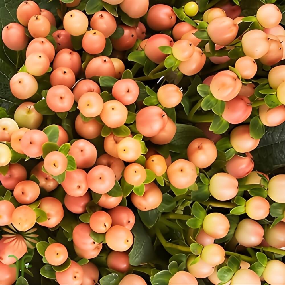 - Peach Hypericum (St. John’s wort) with woody stems and clusters of peach berries, perfect for adding texture.
