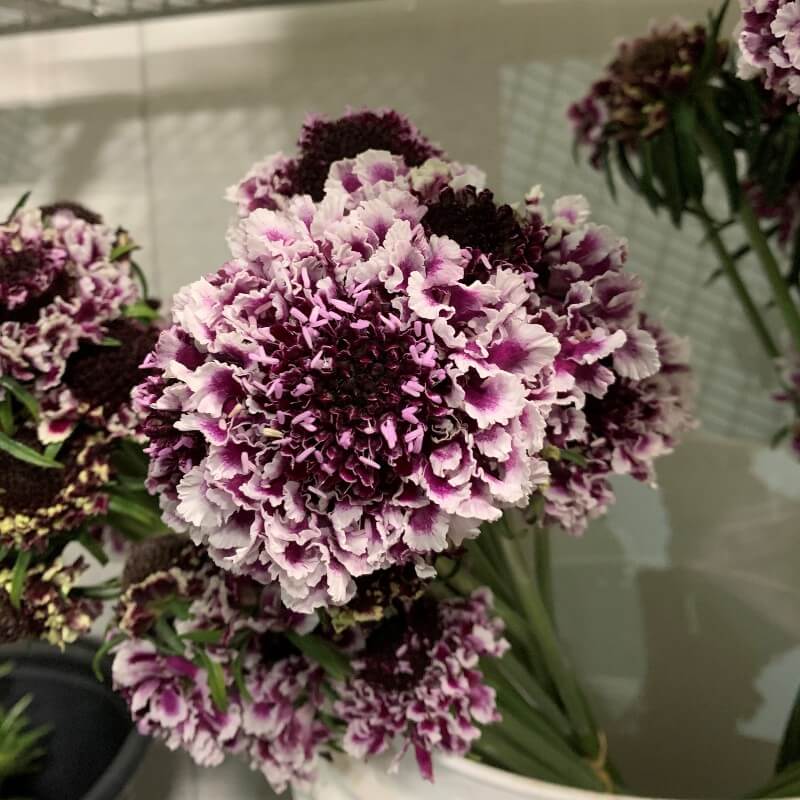 Wholesale Purple and White Van Scoop Scabiosas are also known as pincushion flowers. Purple and white scabiosas have a vase life of about 7-10 days if properly handled. The Scoop series are long lasting and have a larger flower head than the regular. Use a clean vase or bucket and cut the stems upon arrival. Scabiosas take in a lot of water. Keep an eye on water levels in containers or floral foam. Heat sensitive. Used in garden style arrangement and bouquets. There are 10 stems per bunch from most of our growers and are available year-round.