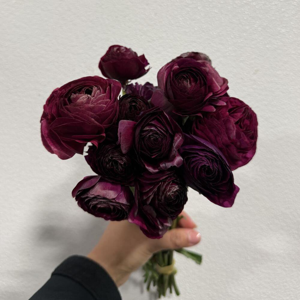 - Purple Stock – Provides additional texture and color that complements the ranunculus.