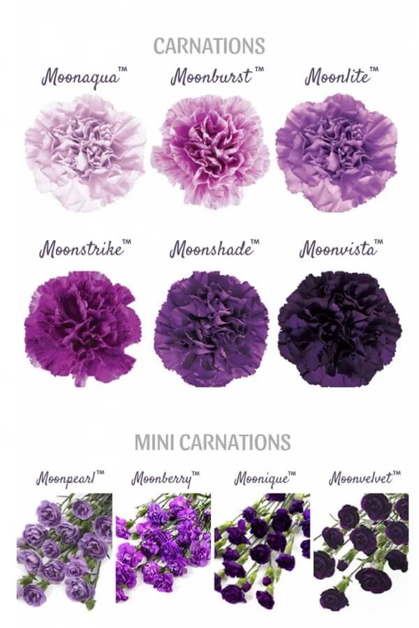 Wholesale Purple Moonberry Mini Carnations: The FLORIGENE® Moonique™ mini carnations offer a rich, deep purple hue that brings a striking contrast to mixed arrangements. With a bud count of 4-5 blooms per stem, these carnations stand approximately 25-30 inches tall. Sold in bunches of 10 stems with multiple blooms per stem. Available year-round, with a recommended preorder of at least 10 days for best availability.