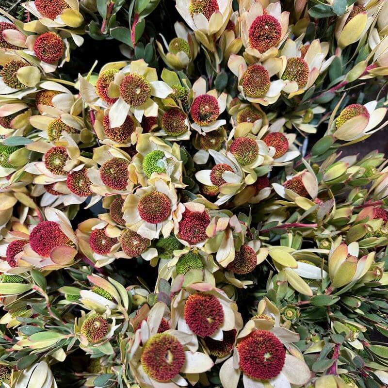 - Green Pittosporum – The fresh greenery provides a balanced, calming contrast to the striking red tones of the Red Cone Leucadendron.
