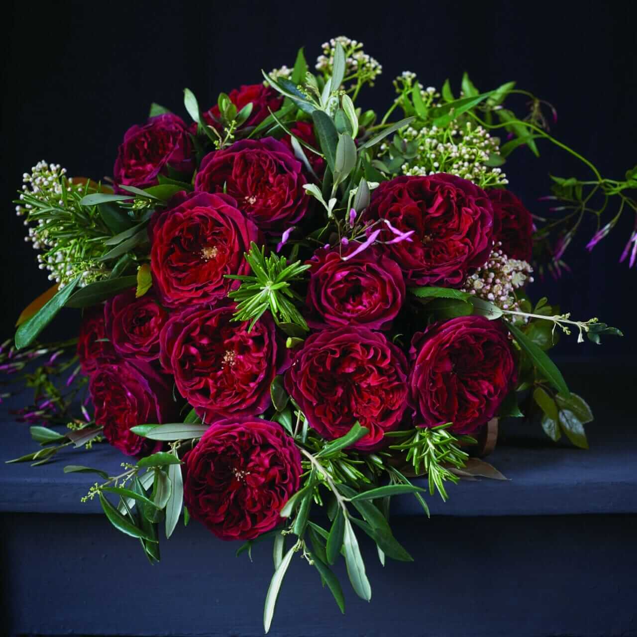 Tess (Ausyacht) is an incredibly opulent velvet red rose in the David Austin Wedding Rose Collection. Her rich crimson blooms are abundant in drama and passion, yet add an obvious refinement to a garden styled flower arrangement. Tess’s ravishing blooms are filled with sumptuous, deep red petals. Each rose starts as a rounded bud with graceful waved edges and as she opens the outer petals surround smaller ruffled petals giving the rose great depth and forming magnificent saucer-shaped rosettes.