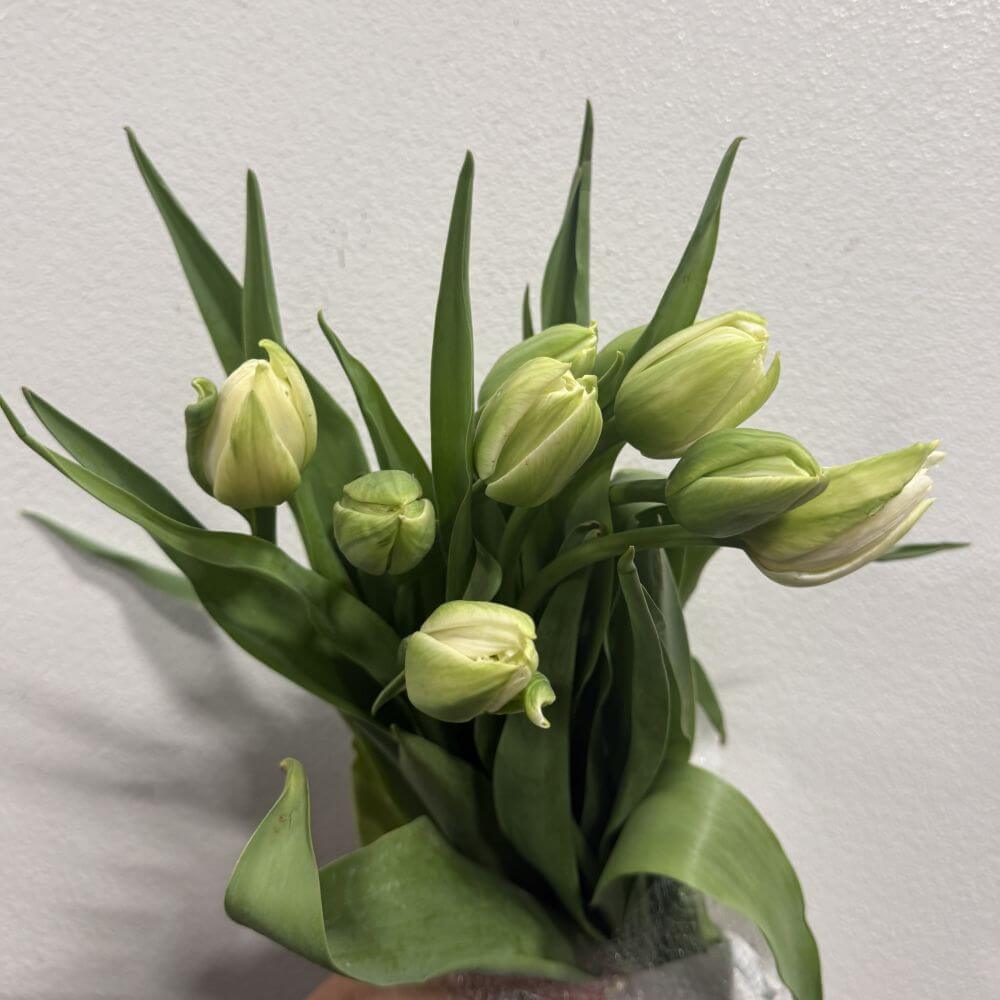 Wholesale White French Tulips feature tall, elegant stems ranging from 25–35 inches and larger blooms than standard tulips. These tulips showcase a creamy white hue, though they may appear slightly buttery at times. Perfect for adding sophistication to tall arrangements or statement bouquets, they are sourced from Holland and France. Sold in 10-stem bunches, these tulips require a two-week advance order, as availability and pricing can vary throughout the year.