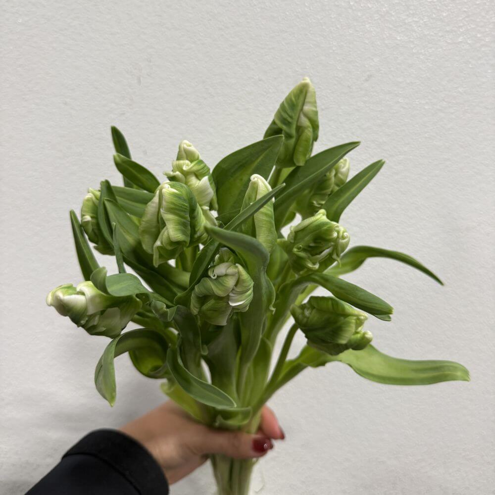 Wholesale White Parrot Tulips, featuring the unique Super Parrot variety, offer stunning, ruffled petals that transition from green to white as they bloom. Known for their graceful, natural movement as they grow toward light, these tulips add charm and a dynamic feel to any arrangement. Best enjoyed from January through May, their distinctive shape and flopped-over look make them a favorite for modern and artistic floral designs. Each bunch contains 10 stems, perfect for adding texture and elegance to centerpieces or bouquets. For optimal availability, please order at least one week in advance.